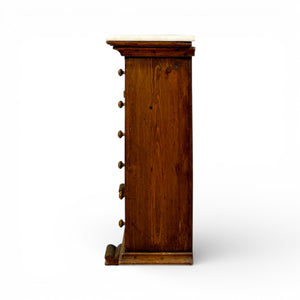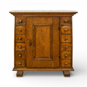 This mid-19th-century apothecary cabinet is crafted in solid pine and crowned with its original white marble top. The design is functional yet distinctive, with a central paneled door flanked by two vertical rows of five drawers each. The pale honey tone of the pine contrasts beautifully with the cooler marble surface, highlighting the natural grain and age-softened finish.
