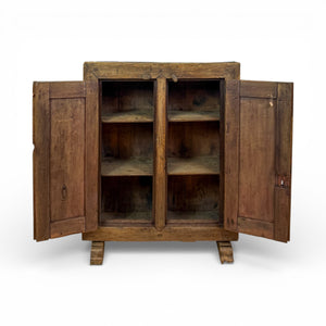 Hand-forged iron hinges and lock hardware remain intact, with the escutcheon displaying a simple foliate motif. The interior is divided by a central stile with three fixed shelves, offering generous and practical storage. Raised on block feet, slightly shaped at the front, the piece retains its original rustic proportions and an honest, tactile presence.