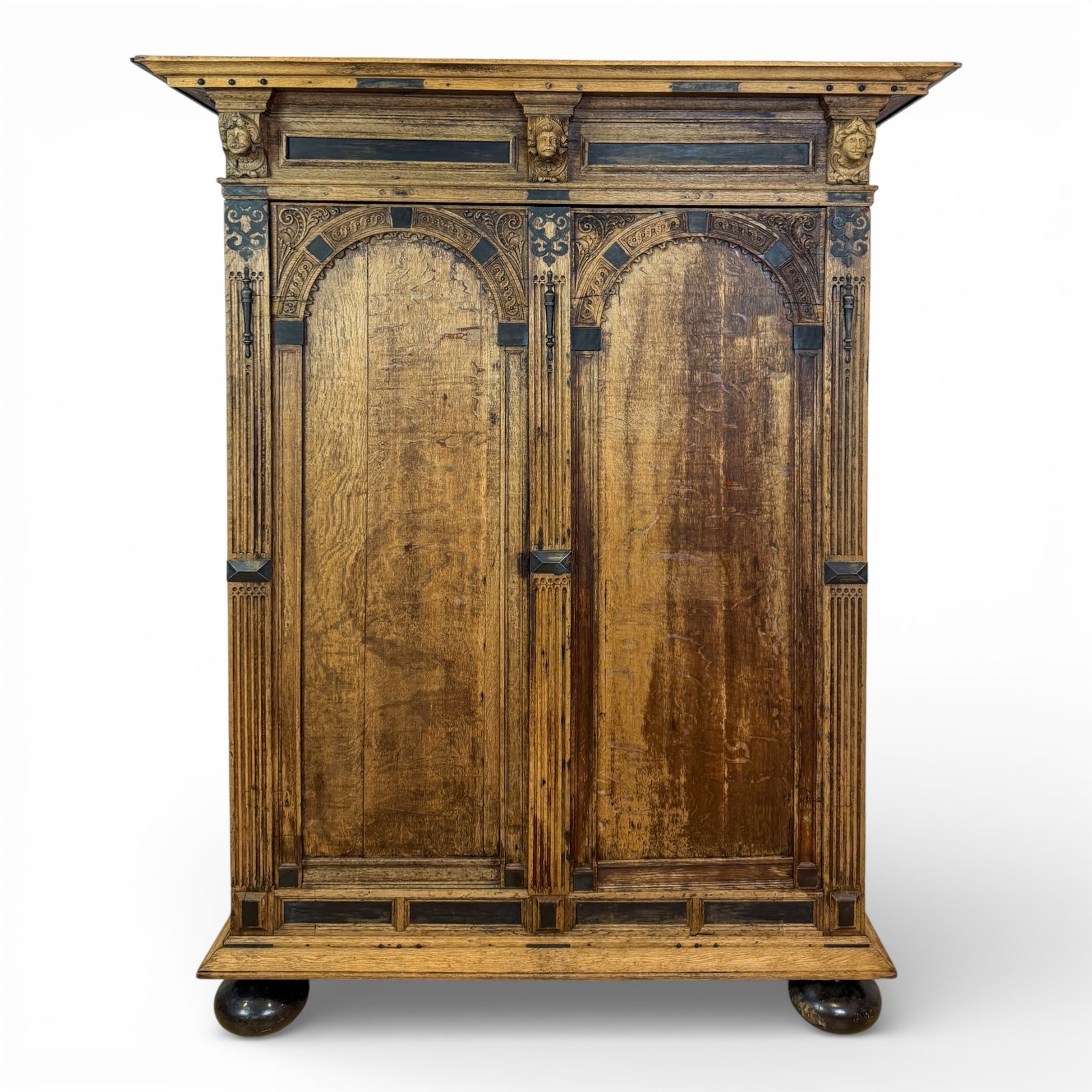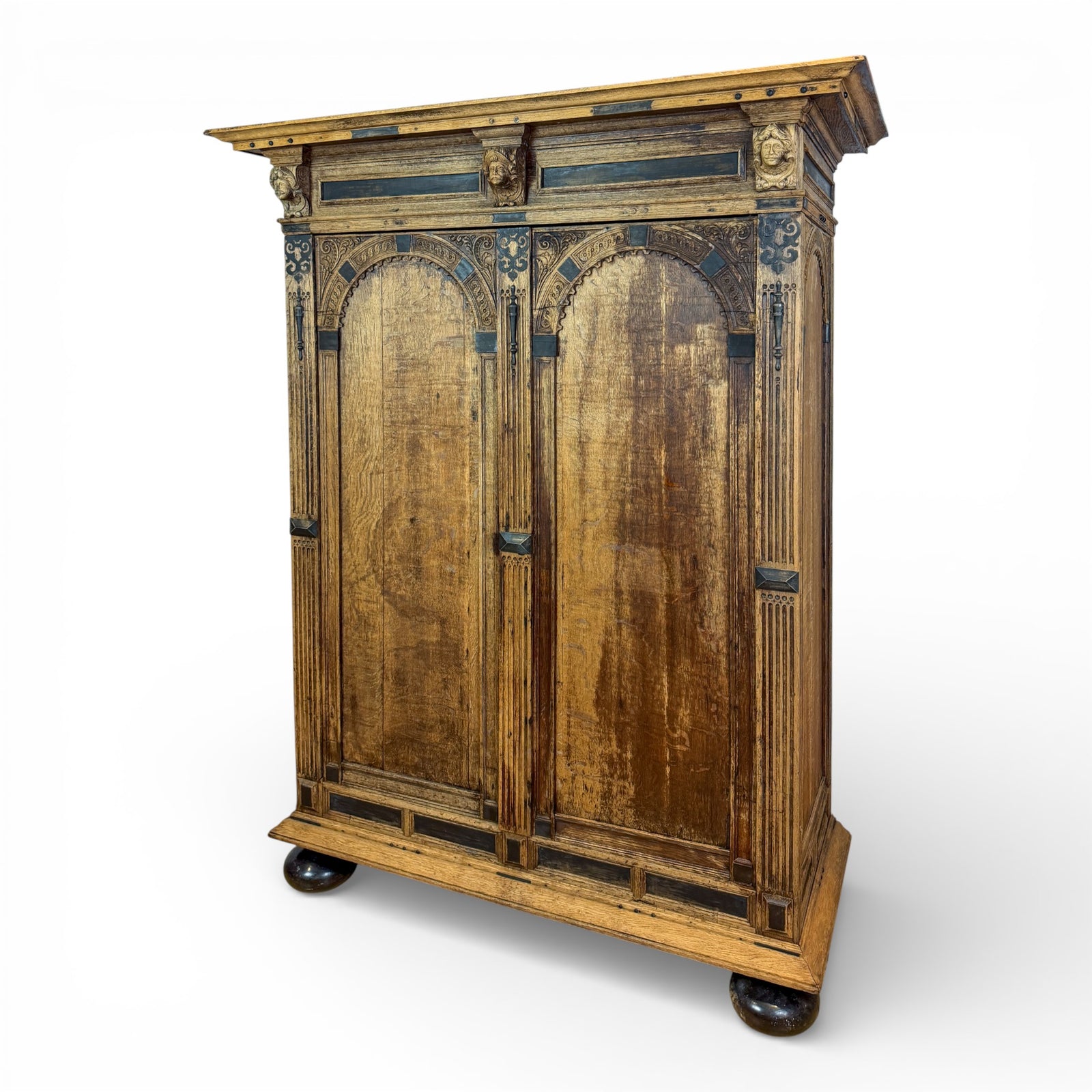 Oak Armoire with Carved Mask Corbels and Ebonized Details