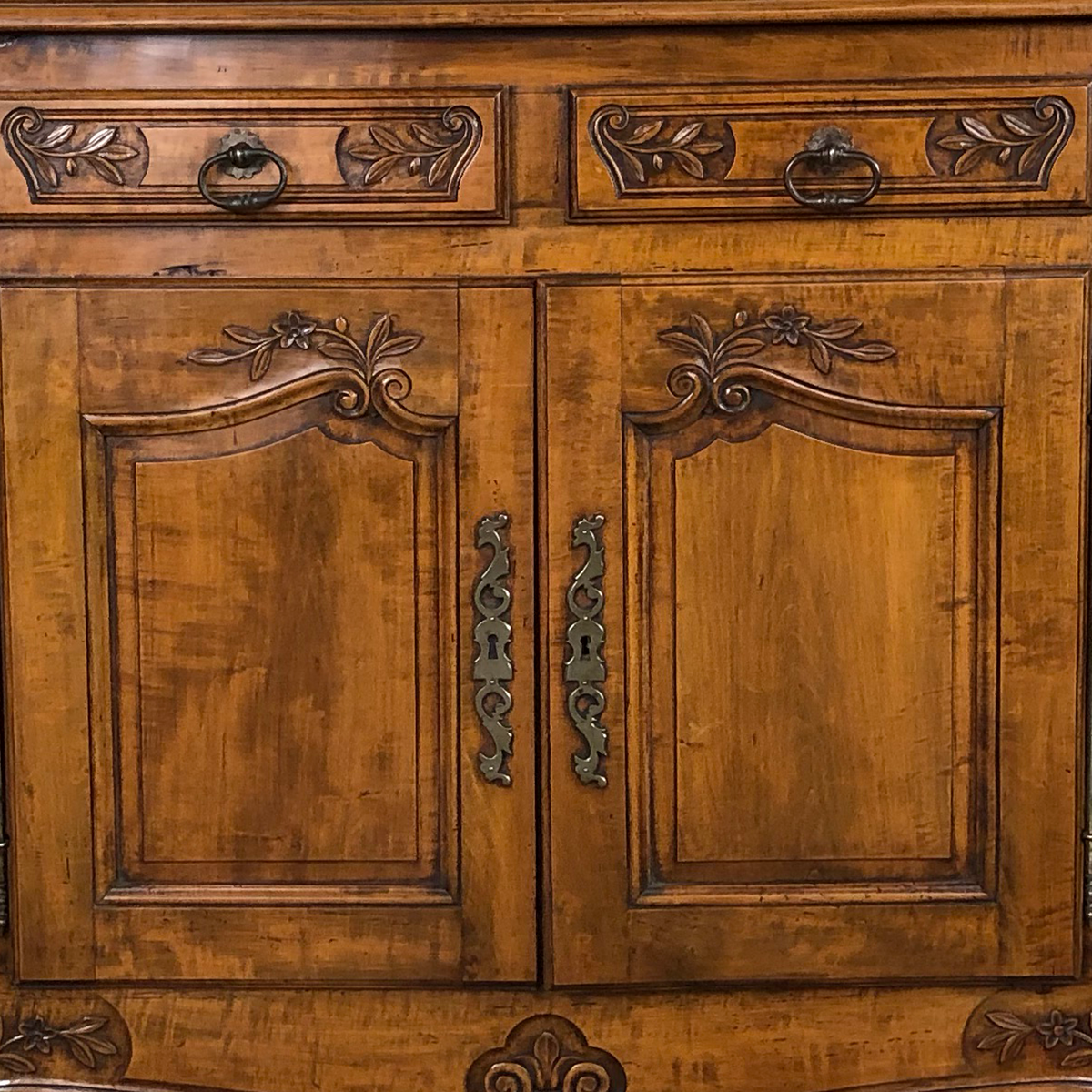 This Louis XV-style buffet exemplifies the grace and opulence of late 19th-century French furniture. The cabinet features a carved front and elegant cabriole legs, all anchored by a hand-carved apron adorned with stylized floral hearth motifs. Each of the four paneled doors is richly molded, crowned with carved rocaille flourishes, and flanked by ornate brass escutcheon handles.