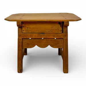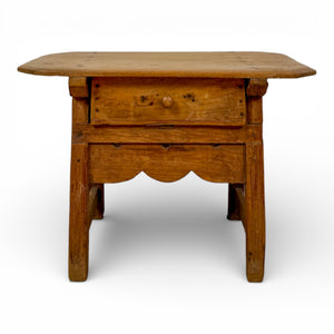 Beneath the top, a scalloped apron introduces a hint of decorative flair to an otherwise utilitarian piece—an aesthetic typical of provincial Spanish furniture. The pale pine shows tool marks, natural wear, and the occasional knot, all of which contribute to its quietly aged character.