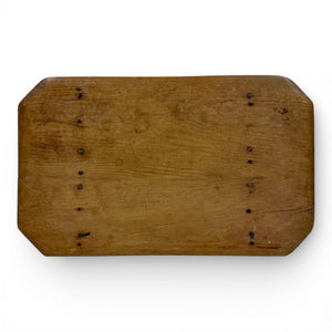 this side table is made from solid pine with a warm, dry patina developed over decades. The rectangular top features clipped corners and exposed dowel construction, resting on splayed legs united by box stretchers for added stability.