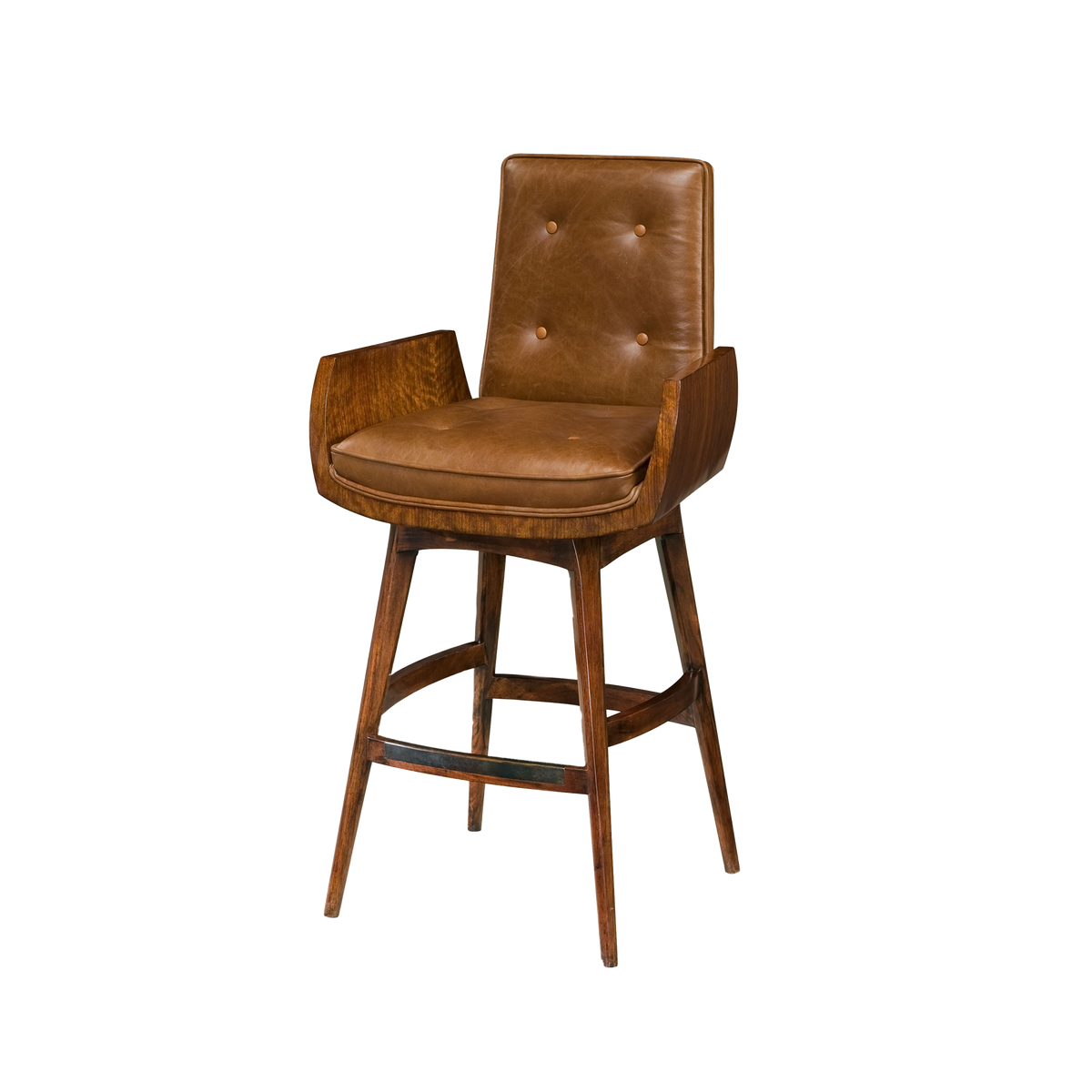 This reproduction Art Deco barstool embodies the elegance and craftsmanship of 1930s design. The frame is crafted from richly toned walnut, displaying the clean, angular lines typical of the era’s modernist influence. The seat and backrest are upholstered in smooth caramel-toned leather with button tufting, lending both comfort and understated sophistication. Slightly flared legs and a metal footrest complete the design, balancing function with timeless appeal.