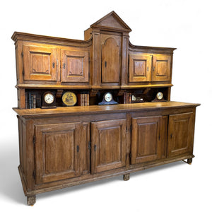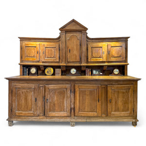 The surface has developed a rich, mellow patina that speaks to over a century of careful use. The craftsmanship is substantial yet balanced, with soft molding details and restrained ornamentation that allow the natural grain of the oak to take prominence. Ideal for a grand dining room or study, this impressive piece offers both visual gravitas and practical storage.