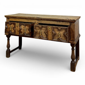 A late 17th-century English side table in oak, likely from the William and Mary period, featuring three drawers with striking geometric moldings. The lozenge-carved drawer fronts reflect regional vernacular styles found in the North and West of England, echoing earlier coffer designs.
