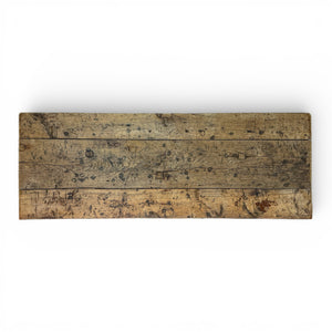 The front legs are turned in a baluster form while the rear legs remain squared and simple, joined by a box stretcher base. The top is formed from thick, wide oak planks, aged with deep surface wear and a dry, bleached finish that lends the piece honest, rustic appeal.