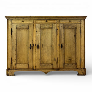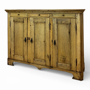 This robust French provincial buffet dates to the mid 18th century and showcases the timeworn elegance of rural craftsmanship. Made from solid oak, the piece retains its original hand-hewn panels and forged iron hardware, with a surface rich in knots, grain, and age-worn character that speaks to centuries of use.