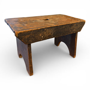 This 19th century primitive stool was crafted with utility in mind, its form pared down to the essentials. Constructed from solid wood planks, the rectangular seat retains layers of worn paint and surface markings that speak to decades of honest use. The central hand-cut slot suggests it was once easily carried from barn to yard, a practical detail rooted in daily agricultural life.